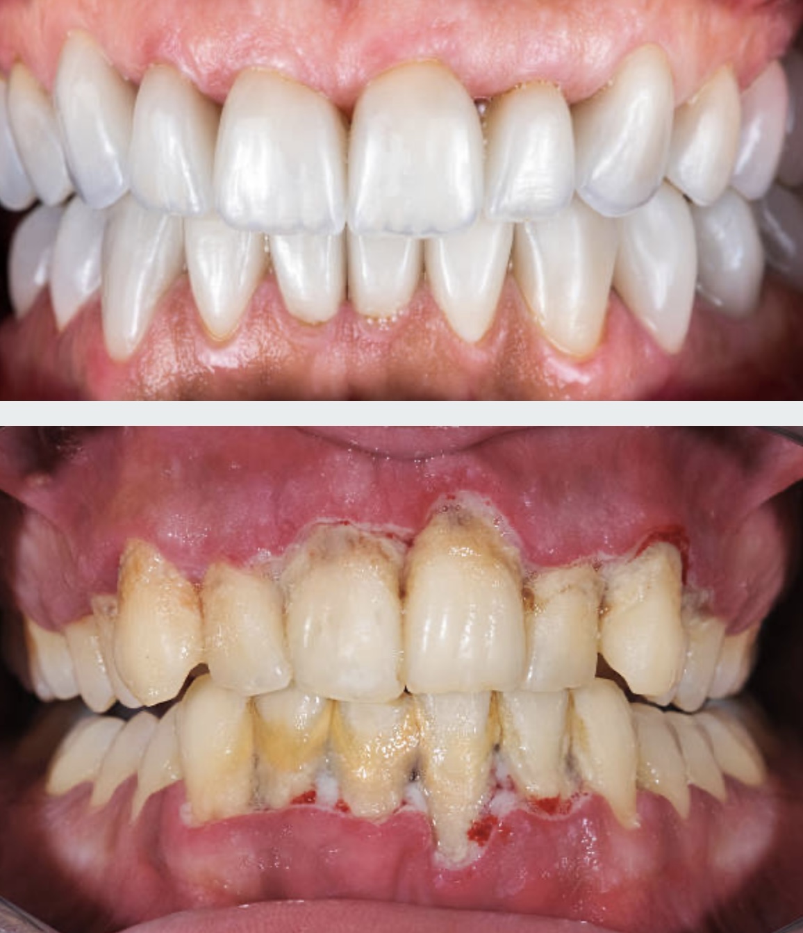 Αιτία της περιοδοντικής νόσου είναι η απουσία καθημερινής σχολαστικής στοματικής υγιεινή που οδηγεί σε πολλαπλασιασμό των μικροβίων που υπάρχουν στο στόμα, τα οποία σε συνδυασμό με τα μικρόβια που δημιουργούνται από τα υπολείμματα των τροφών –μικροβιακή πλάκα –μετατρέπονται σε παθογόνα μικρόβια και εξελίσσονται σε έντονη φλεγμονή στην περιοχή των ούλων και στα οστά της γνάθου.